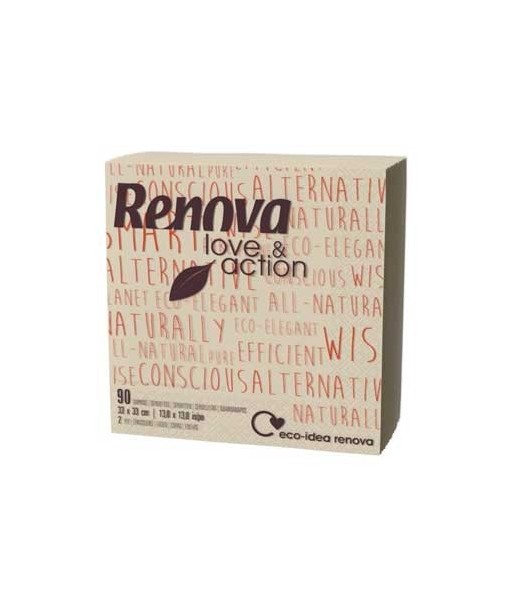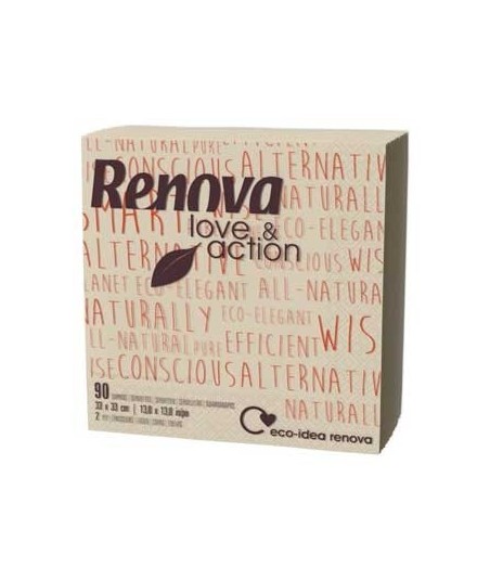 Renova Love & Action, são fabricados com papel cru natural, maioritariamente proveniente da reciclagem de papéis já usados, sendo a pasta proveniente da floresta certificada ou de origem controlada. A certificação FSC ® assegura que os produtos provêm de explorações com gestão florestal responsável, uma das formas mais efetivas de mitigação das alterações climáticas. ¶¶Papel Cru Natural¶Dimensão do guardanapo: 33x33cm¶90 guardanapos por maço¶¶Papel de folha dupla¶EU Ecolabel: PT/004/001¶FSC® C136137