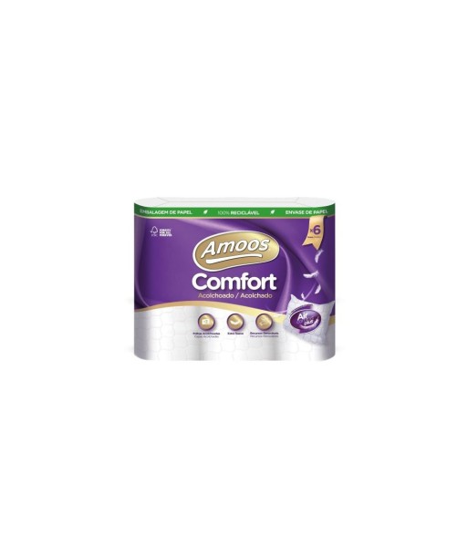 Extra suavidade e conforto para quem quer mais no seu dia a dia!¶¶O novo Higiénico Amoos Acolchoado 3 folhas apresenta uma suavidade extra e maior sensação de conforto graças à sua nova textura almofadada Air Comfort Plus. ¶A nova tecnologia de bolsas de ar forma pequenas almofadas de conforto entre as três camadas de papel, proporcionando cuidado extra para quem quer mais no seu dia a dia.¶¶O nosso papel é proveniente de recursos renováveis, é 100% fibra virgem, certificado e dermatologicamente testado: ¶Da matéria prima à produção o nosso papel percorre um caminho totalmente verde e sustentável, proveniente de florestas geridas de forma responsável.¶¶Papel ¶Qualidade: Branco, 100% Fibra Virgem ¶N.º Folhas: 3 ¶Gramagem (gr/m²): 48 ¶¶Certificados: FSC, EU Ecolabel¶¶Suportes compatíveis: ¶#15640258 - Suporte Papel Higiénico Autoadesivo Cromado Tesa Klaam¶#15640271 - Suporte Papel Higiénico Extra Autoadesivo Cromado Tesa Klaam ¶#6821068 - Suporte Papel Higiénico Extra Cromado