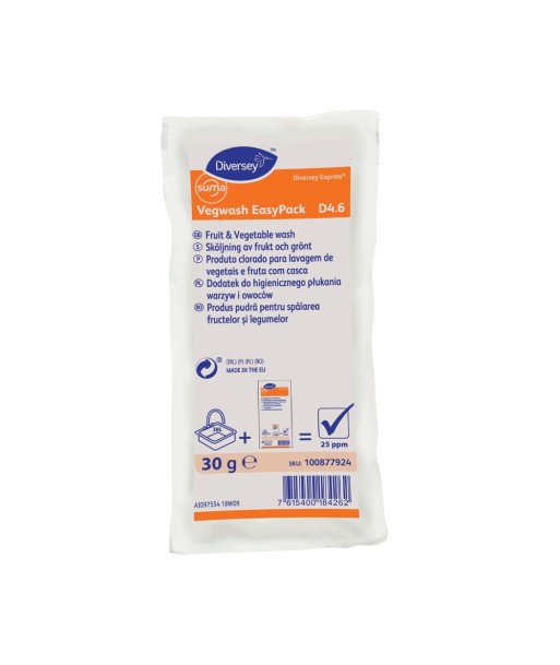 Propriedades¶Suma Vegwash EasyPack D4.6 é um pó concentrado em saquetas para a lavagem de saladas, frutos e outros vegetais. Este produto é um pó clorado muito eficaz para a lavagem higiénica de vegetais. ¶Embalado em saquetas que proporcionam aos utilizadores conveniência e flexibilidade no uso do produto.¶Uma saqueta por 10 L de água permite obter 90 a 100 ppm de cloro ativo.