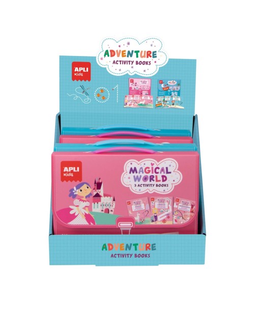 Expositor de livros de atividades de aventura de 6 unidades com 2 temas diferentes: O mundo mágico e os piratas. ¶Ideal para as crianças praticarem atividades educativas no seu tempo livre enquanto se divertem ao mesmo tempo. ¶¶Cada expositor contém:¶3x Maletas Atividades Mundo Mágico¶3x Maletas Atividades Piratas¶¶Cada maleta contém:¶3 Livros com folhas laminadas e diferentes atividades para fazer (números, labirintos e correspondências)¶1x Caneta que permite apagar e reutilizar as atividades repetidamente¶¶Idade Recomendada: +3 anos