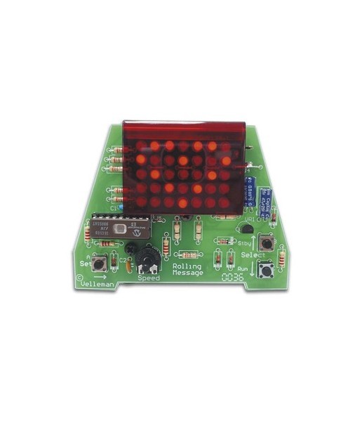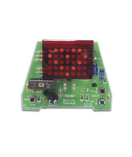 Crie sua própria mensagem em movimento. ¶Display gráfico com 35 LEDs. ¶Max. 16 caracteres. ¶Velocidade de rolagem ajustáveis. ¶¶Pressione "SET" para alterar um caracter especial. ¶Pressione o botão para cima ou para baixo-para seleccionar um caracter e termina com o "<"-sign. ¶Exibir a função de espera: pressione "Stby" (tiragem de reiniciar).¶¶Fonte de alimentação: 9-12VDC adaptador ou bateria de carro¶Consumo de corrente: 20mA máx. / Standby 4mA¶Tipo de bloco de 9V 6LR61 / 6F22: bateria de backup¶Dimensões: 46/89 x 67 milímetros (1.8/3.5 x 2,6 ")¶¶Tipo de embalagem: Blister cartão¶