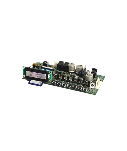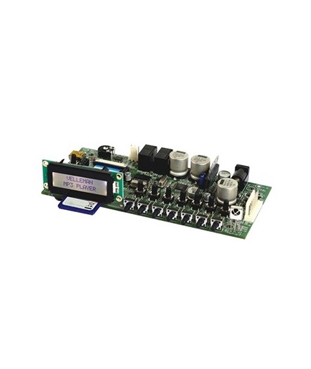 Crie o seu próprio sistema de áudio doméstico, jukebox, jingle player, mensagens de áudio, efeitos sonoros, MP3, onde quiser e como quiser!¶¶7 botões predefinidos definíveis pelo usuário com conexão externa¶saída de linha ou telefones: jack de 3,5 mm¶saída direta do alto-falante estéreo: conector de 3,5 mm¶funciona com cartão SD¶descodificador VLSI de elevada qualidade¶play-pausa, próximo, anterior, procurar¶controlo de volume¶modo de reprodução aleatório¶8 modos de som pré-definidos¶6 modos de reprodução: All, Folder, At power-on...¶receptor por infra-vermelhos incorporado¶amplificador de potência incorporado¶possível utilização em mono¶¶opcional :¶módulo receptor RF: RX433N¶adaptador : PSS1215¶comando à distância RF: para EU e US¶transmissor RF de 8 canais: VM118R (mounted)¶comando à distância RF de 8 canais: K8058 (Kit-version)¶comando à distância IR: apenas para EU¶transmissor de mesa com 4 canais: VM160DT¶transmissor de 4 canais: VM160T¶comando à distância IR:¶transmissor IR de 15 canais: K8049 (versão Kit)¶¶Compatível com cartões SD e SDHC¶testado com cartões até 32GB¶suporta informação ID3 TAG : Título, Nome Artista,Nome Album e Ano aparecem no ecrã PC1602WRS-KWA-E: LCD 16x2 STN Grey Positive Transflective WHITE Backlight com 2-linhas e 16 caracteres.¶classificação em pastas de 1 nível¶até 1024 pastas, cada uma contendo até 16384 canções¶equalizador : Flat , Loudness, Heavy, Clear, Soft, Disco, Live e Hall¶descodificação MP3 (MPEG 1.0 & 2.0 audio layer III (CBR, VBR, ABR), até 320kbit/s. Fraunhofer IIS e sob licença Thomson¶amplificador: 2x 5Wrms @ 4ohm¶alimentação : 12Vdc/1A¶dimensões : 132 x 62mm
