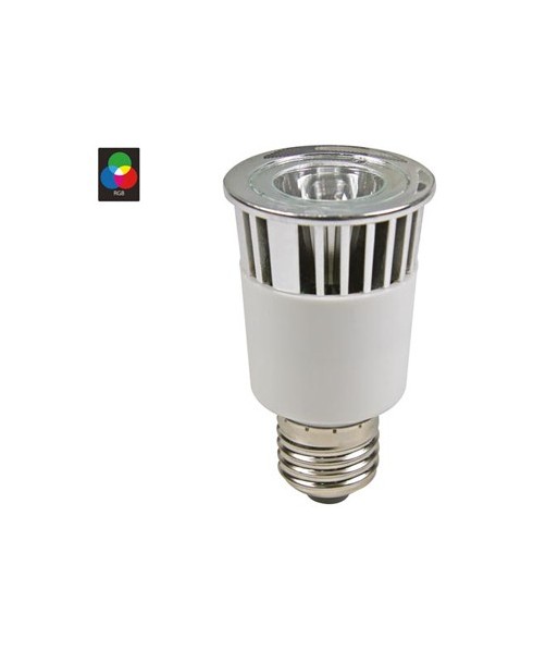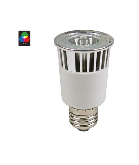 Potente projector LED RGB para efeitos atmosféricos em casa ou em festas¶Necessita de um controlo remoto opcional para funcionar (LAMPL5RGB/RCN, não incluído)¶Muito fácil de criar efeitos multicoloridos ¶¶Consumo de energia muito baixo¶Emissão de calor muito baixa¶¶Alimentação eléctrica: 230VAC / 50Hz¶Consumo de energia: 5W¶Vida útil: > 10 000h¶Fluxo luminoso: 50 lm¶Casquilho: E27¶¶Dimensões: Ø50 x 86,90mm (orifício de montagem Ø45mm)¶Peso: 97g