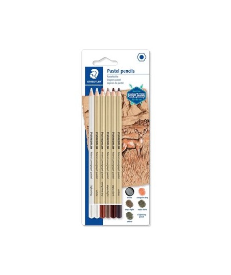 Mars® Lumograph® 100P Lápis pastel¶¶Blister contém 6 lápis pastel em cores sortidas¶Cores: Sépia claro, sépia escuro, castanho ferrugem, sanguínea seco, branco, iluminador¶Diâmetro da mina: aprox. 3,6 mm¶¶Lápis pastel de alta qualidade¶Fórmula especial da mina com alto nível de pigmentação para criar detalhes precisos em pastel¶Ideal para misturar e para sombreado, assim como para criar retratos e esboços expressivos¶¶Madeira com certificado FSC, proveniente de florestas de gestão sustentável¶Apara-lápis recomendado: Apara-lápis duplo Mars 510 25 ou lixa 923 para lápis bem afiados