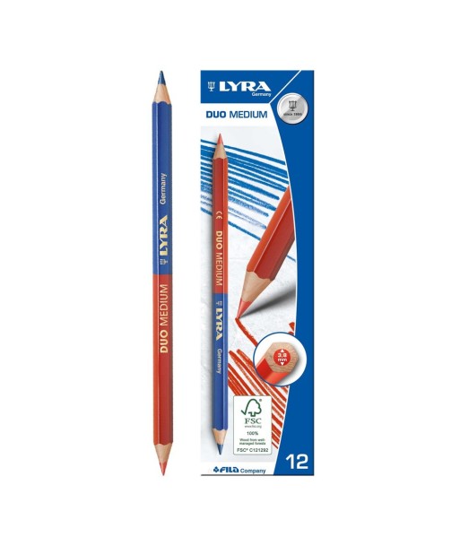 Lyra Duo: Lápis 2 em 1¶¶Duas cores num só lápis e imensas possibilidades para o usar este versátil lápis Lyra Duo! ¶Este lápis hexagonal está revestido com as cores das minas em cada extremidade. ¶São ideais para professores e profissionais que necessitam 2 vezes mais performance.¶¶Duo Medium Azul/Vermelho¶Corpo: Hexagonal¶Mina de 3,8mm¶¶Fabricada em madeira certificada PEFC e fácil de afiar.