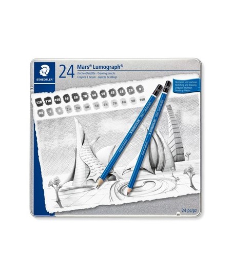 Mars® Lumograph® 100 Lápis de desenho¶¶Caixa metálica com 24 lápis de desenho, em vários graus consistentes de classificação fina: ¶12B, 11B, 10B, 9B, 8B, 7B, 6B, 5B, 4B, 3B, 2B, B, HB, F, H, 2H, 3H, 4H, 5H, 6H, 7H, 8H, 9H, 10H¶¶Lápis de desenho de alta qualidade¶Mina com fórmula especial para resultados com brilho metálico numa ampla variedade de tons de cinzento¶Especialmente adequado para escrita, desenho, esboço e sombreado, bem como para aplicações gráficas e artísticas profissionais em papel e película mate para desenho¶Especialmente resistente à quebra devido à super-mina¶¶Boa reprodutibilidade dos traços¶Madeira com certificado PEFC, proveniente de florestas de gestão sustentável¶¶Apara-lápis recomendado: apara-lápis tubular 511 001 ou apara-lápis metálico 510 10 para lápis bem afiados