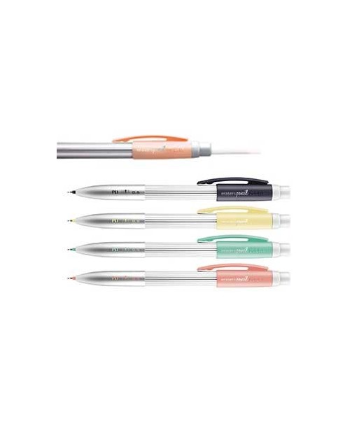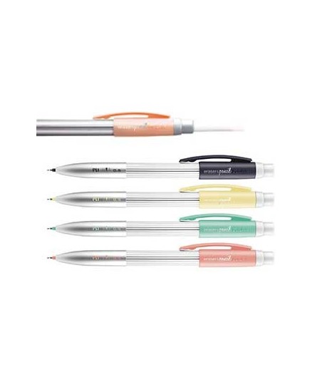 Lapiseira com borracha - cores sortidas (amarelo, azul, rosa, turquesa).¶Mina de 0,5 mm HB que cria traços de linhas finas. ¶Borracha MILAN extra grande. ¶¶Borrachas sobressalentes disponíveis (sob consulta).¶¶Disponível em prata com detalhes em 4 cores: amarelo, azul, rosa, turquesa.¶Medidas da lapiseira PL1: 14,4 x 1,5 x 1,1 cm. ¶¶