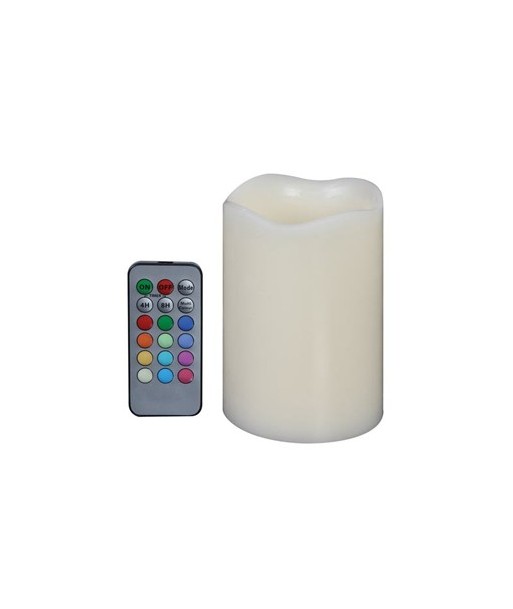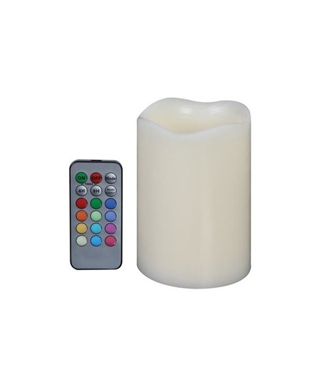 Vela única em cera com LED RGB e controlo remoto¶¶Seleção de 12 Cores¶Modo fixo e intermitente, seleção de temporizador duplo¶Modos de mudança automática de cor¶Com interruptor¶¶Fonte de alimentação: pilhas LR03C 3 x AAA (não incl.)¶Controlo remoto de substituição: XMCL15RC¶¶Dimensões: Ø90 x 126 mm ¶Peso: 365g¶