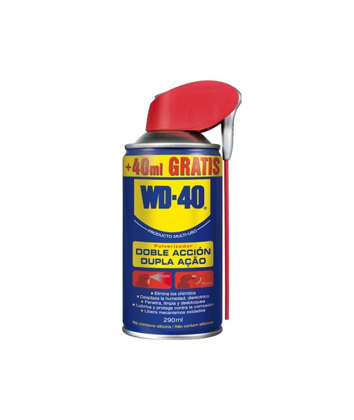 WD-40® PRODUTO MULTI-USO DUPLA AÇÃO¶O sistema inovador inovador do formato WD-40 Produto Multi-Uso Dupla Ação permite alternar facilmente de uma aplicação ampla para uma precisa em apenas um click sem perder a cânula.¶Aplica a fórmula mágica dos 2.000 usos de forma cómoda e simples!¶¶Lubrifica¶Lubrifica peças em movimento tais como dobradiças, rolamentos, correntes e engrenagens.¶¶Renova¶Limpa cromados e qualquer superfície metálica, eliminando também autocolantes e restos de pintura.¶¶Repele a humidade¶Repele a humidade dos quadros elétricos, velas e material elétrico em geral.¶¶Desbloqueia¶Penetra e liberta peças bloqueadas e oxidadas, tais como porcas, cadeados e pistões.¶¶Protege¶Protege contra a oxidação e corrosão.¶¶Benefícios¶Sistema Dupla Ação que permite uma aplicação ampla ou precisa em apenas um click.¶Fácil de usar e evita a perda da cânula.¶Penetra nas superfícies para libertar peças bloquedas.¶Lubrifica e protege mecanismos e componentes do desgaste¶Protege da corrosão.¶Repele da humidade e é dielétrico.¶¶Usos e aplicações¶Protege equipamentos e ferramentas da oxidação.¶Protege contactos elétricos.¶Lubrifica e protege a corrente, pratos e partes móveis da bicicleta.¶Lubrifica fechaduras e dobradiças.¶Protege ferramentas elétricas da humidade e desgaste.¶Elimina sujidade, óleo e renova cromados, plásticos e metais.¶