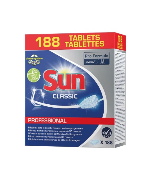 Sun Pro Formula Classic Tablets é um detergente concentrado em pastilha de alcalinidade suave para utilizar em máquinas de ciclo curto ou longo. ¶Indicado em todo o tipo de águas devido à presença de agentes sequestrantes de dureza. ¶Muito eficaz na remoção de gorduras, pois combina alcalinidade média e ação enzimática, assim como na redução das manchas em virtude da presença de oxigénio ativo. ¶Sun Pro Formula Classic Tablets foi concebido para trabalhar com Sun PF Secante.¶¶Propriedades¶Adequado para máquinas de ciclo longo e curto em todas as durezas da água. ¶Com minerais protetores que ajudam a proteger a estrutura da superfície do vidro. ¶Para excelentes resultados de limpeza, secagem rápida e brilho. ¶Para loiça, talheres, vidros, tachos, panelas e utensílios.¶¶Benefícios¶Pastilhas concentradas asseguram excelentes resultados¶Dosagem fácil e cómoda¶Eficaz remoção de manchas devido à presença de oxigénio ativo¶Indicado para todo o tipo de águas e máquinas de ciclo curto ou longo¶¶Instruções Utilização¶Retirar o invólucro de fluxo e colocar 1 pastilha no dispensador, evitando tocar com as mãos molhadas. ¶Certificar-se de que os dispensadores de sal e de abrilhantador não estão vazios. ¶Certifique-se de que coloca apenas artigos próprios para a máquina de lavar louça.¶Limpe regularmente os braços de pulverização e certifique-se de que podem rodar livremente. ¶Não sobrecarregue a sua máquina. ¶Estas pastilhas funcionam bem a baixas temperaturas (45° C).