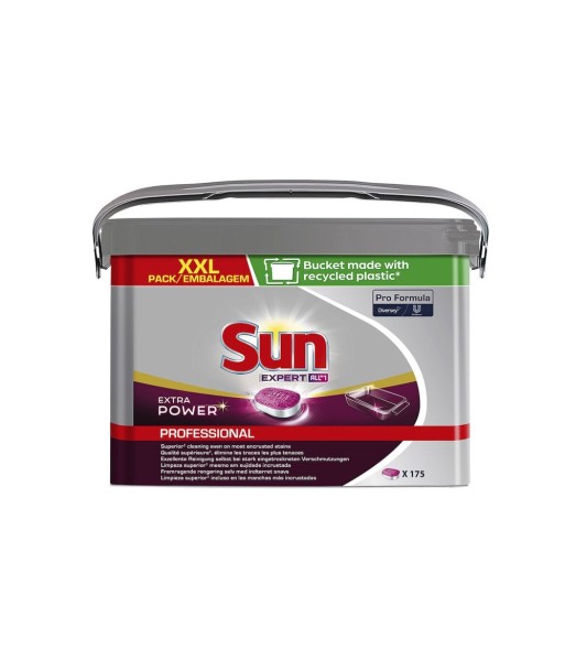 Sun All in One Extra Power com tecnologia Sun PURE CLEAN TECHNOLOGY para ação desincrustante, desengordurante e remoção de manchas, foi totalmente redesenhada - agora com forma oval 3D - para garantir melhores resultados de limpeza. ¶Os agentes desincrustantes e desengordurantes eliminam todas as manchas, mesmo as mais incrustadas ¶¶Benefícios ¶Limpeza Superior mesmo em sujidade incrustada ¶Prático e fácil de usar, não necessita de adicionar secante nem sal, devido à sua função tudo numa só pastilha (All in 1) ¶Remoção efetiva de manchas, mesmo as mais incrustadas ¶¶Pro Formula ¶Um ambiente perfeitamente limpo está na base de qualquer experiência e relacionamento duradouro com o cliente. ¶Pro Formula coloca à sua disposição uma gama completa de produtos de limpeza com fórmulas profissionais e marcas de confiança da Unilever, como Skip, Comfort, Surf, Cif, Sun, Sunlight, Domestos ou Lux. ¶Esta gama foi desenvolvida especificamente para ir ao encontro das necessidades dos seus negócios, proporcionandolhe os resultados excecionais de uma limpeza profissional.¶¶Aplicação ¶Sun Pro Formula All in 1 Extra Power é recomendado para os materiais normalmente encontrados em cozinhas, no entanto não deve ser usado em materiais como alumínio, cristal e objetos com decorações em prata ou ouro. ¶Instruções de utilização Saqueta 100% solúvel. ¶Não é necessário abrir. Coloque 1 pastilha com HYDROFILM diretamente no local da dosagem. ¶Não toque nas pastilhas com as mãos molhadas. ¶Para ciclos curtos de lavagem coloque a pastilha diretamente dentro da máquina ou no cesto dos talheres. ¶Se os alarmes de sal ou secante estiverem a piscar isso é normal, essas funcionalidades são cobertas pelas pastilhas All in 1. ¶Para águas muito duras (> 35° fH / 21° dH) deverá ser usado sal adicional. Limpar regularmente os braços de lavagem e garantir que podem girar livremente.¶¶Aspeto: Pastilha Branca e púrpura¶pH (a 1% solução): ± 11 ¶Odor:Ligeiramente perfumado