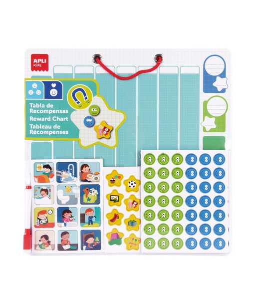 Tabela de recompensas magnéticas original para motivar as crianças nas atividades que devem ser reforçadas ou aprendidas.¶É adequado para duas crianças, então cada uma terá sua própria pontuação.¶Com o marcador apagável, pode escrever os dias da semana, os nomes das crianças e os rostos que devem obter.¶Tudo o que precisa fazer é escolher cinco tarefas e está tudo pronto para começar a cumpri-las e colocar os rostos!¶¶O jogo inclui:¶1 tabuleiro com cordão para pendurar¶104 peças magnéticas¶1 marcador com borracha¶12 peças quadradas (tarefas a realizar)¶8 peças em forma de estrela (recompensas)¶84 faces, 42 faces de cada cor (conquistas) ¶ ¶Medidas 35,5 x 35,5 cm¶Idade recomendada +5 anos