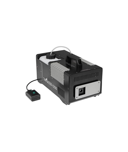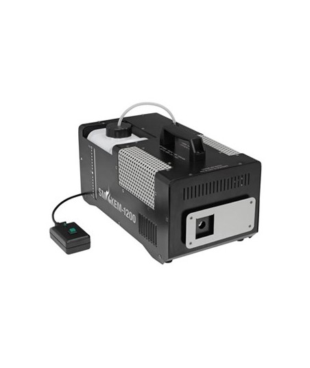 Máquina de fumo 1200 W com controlo remoto removível¶Tanque de fluido removível¶DMX: Não¶Sem sensor de fluido¶Temporizador controle remoto opcional¶¶Especificações¶Alimentação: 220-240 VAC 50/60 Hz¶Consumo de energia: 1200 W¶Fusível: F7A¶Tempo de aquecimento: 6 min.¶Saída: ± 849 m³ / min¶Capacidade do tanque: 1,8 L¶Consumo de fluido: 10 - 12 ml / min¶Classificação IP: IP20¶Controlo remoto: cabo removível¶Comprimento do fio do controlador remoto: 3,5 m¶DMX: -¶Dimensões: 385 x 205 x 175 mm¶Peso: 5,58 Kg¶¶Tipo de embalagem: Caixa (Carton)¶