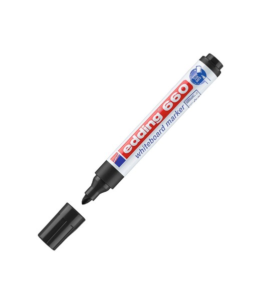 MARCADOR DE QUADRO BRANCO EDDING 660 - O CONFIÁVEL¶¶Depois de reuniões ocupadas ou de deixar notas em casa, pode acontecer que a tampa de um marcador não seja recolocada. ¶Com o marcador de quadro branco edding 660, não há necessidade de se preocupar. ¶Pode ser deixado aberto por vários dias sem secar, para que qualquer pessoa possa usá-lo instantaneamente.¶Melhor ainda, os resultados da escrita podem ser facilmente limpos a seco de qualquer quadro branco sem deixar nenhum resíduo.¶¶Este edding escreve perfeitamente em outras superfícies lisas e não porosas, como esmalte, vidro ou melamina. ¶Tem uma ponta redonda para um traço uniforme, é de secagem rápida e resistente à luz. ¶É a solução confiável para quem usa constantemente quadros brancos.¶¶Marcador de quadro branco para escrever e marcar em quadros brancos e também adequado para flipcharts¶A escrita pode ser limpa a seco de praticamente todas as superfícies não porosas, como esmalte e melamina¶A ponta redonda tem uma largura de traço de 1,5-3 mm¶Graças à tecnologia cap-off, a tampa pode ser deixada por vários dias sem que o produto seque (clima de teste de acordo com ISO 554)¶A tinta do marcador de quadro branco é leve e de secagem rápida¶Sem adição de acetato de butila¶¶Recarga Compatível:¶#1320251 - Recarga Marcador Quadros Brancos Edding BTK25 Preto 25ml 1un