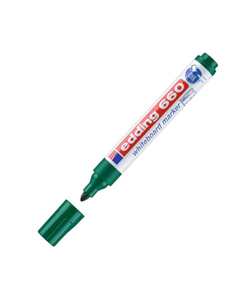 MARCADOR DE QUADRO BRANCO EDDING 660 - O CONFIÁVEL¶¶Depois de reuniões ocupadas ou de deixar notas em casa, pode acontecer que a tampa de um marcador não seja recolocada.¶Com o marcador de quadro branco edding 660, não há necessidade de se preocupar.¶Pode ser deixado aberto por vários dias sem secar, para que qualquer pessoa possa usá-lo instantaneamente.¶Melhor ainda, os resultados da escrita podem ser facilmente limpos a seco de qualquer quadro branco sem deixar nenhum resíduo.¶¶Este edding escreve perfeitamente em outras superfícies lisas e não porosas, como esmalte, vidro ou melamina.¶Tem uma ponta redonda para um traço uniforme, é de secagem rápida e resistente à luz. ¶É a solução confiável para quem usa constantemente quadros brancos.¶¶Marcador de quadro branco para escrever e marcar em quadros brancos e também adequado para flipcharts¶A escrita pode ser limpa a seco de praticamente todas as superfícies não porosas, como esmalte e melamina¶A ponta redonda tem uma largura de traço de 1,5-3 mm¶Graças à tecnologia cap-off, a tampa pode ser deixada por vários dias sem que o produto seque (clima de teste de acordo com ISO 554)¶A tinta do marcador de quadro branco é leve e de secagem rápida¶Sem adição de acetato de butila¶¶Recarga Compatível:¶#1320254 - Recarga Marcador Quadros Brancos Edding BTK25 Verde 25ml 1un