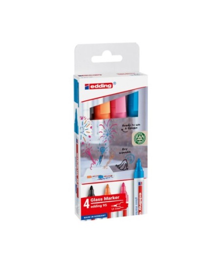 Pack Marcadores para Vidro Edding 95 - Prontos a Usar de Imediato¶¶As superfícies de vidro tornaram-se muito populares, oferecendo transparência e um visual moderno.¶Com o marcador certo, as paredes de vidro no trabalho, no escritório em casa ou até na cozinha podem transformar-se numa superfície de escrita em poucos segundos.¶O marcador para vidro edding 95 é a escolha ideal para superfícies de vidro - perfeito para visualizar rapidamente ideias de grupo, registar os resultados de sessões de brainstorming ou reuniões de equipa, ou simplesmente para anotar recados de forma prática.¶Naturalmente, a tinta pode ser apagada a seco sem deixar vestígios.¶¶Marcador para escrita e marcação em superfícies de vidro e quadros de vidro¶Também adequado para quadros brancos (whiteboards)¶A escrita pode ser apagada a seco facilmente da maioria das superfícies de vidro e quadros de vidro¶Pronto a usar de imediato¶Tinta opaca e com cores intensas¶¶Forma da ponta: ponta redonda¶Espessura do traço: 1,53 mm¶Baixo odor¶Resistente à luz¶Luminoso¶Produto de marca de alta qualidade¶Fabricado na Alemanha¶¶Cores:¶Preto, Azul Claro ¶Laranja Fluorescente, Rosa Fluorescente (Estas tonalidades brilham sob luz UV, tornando-as ideais para realce e efeitos vibrantes em quadros de vidro coloridos)¶