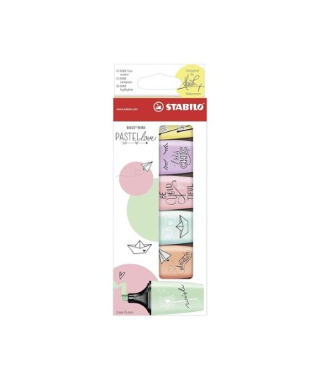 STABILO BOSS MINI Pastel - Edição Limitada¶¶É impossível imaginar o mundo dos marcadores sem tons pastel. ¶Com esta edição, a STABILO está a transmitir mensagens positivas que espalham alegria.¶Estamos felizes pela continuação da cooperação com a artista Hannah Rabenstein, que criou estes fantásticos motivos de lettering e são são lançados como edição limitada.¶¶Uma brisa refrescante sopra sobre as secretárias e o sol nasce!¶No prático formato MINI, estes pequenos marcadores tornam-se um must-have motivador para os amantes de lettering e entusiastas de cores suaves.¶Naturalmente, destacam-se pela qualidade STABILO na marcação, sublinhado e design.¶Com as duas larguras de linha de 2 mm e 5 mm, podes trabalhar de forma concentrada ou criar designs variados.¶¶Leva-o no bolso e sê criativo em qualquer lugar, em formato mini as 6 tonalidades pastel suaves estão totalmente na moda.¶Qualidade STABILO comprovada em termos de acabamento, tinta e conforto de escrita para um trabalho profissional, marcação e sublinhado.¶¶Tinta à base de água. ¶Ponta biselada: 2 larguras de linha: 2 mm e 5 mm para sublinhar e destacar.¶Seca rapidamente.
