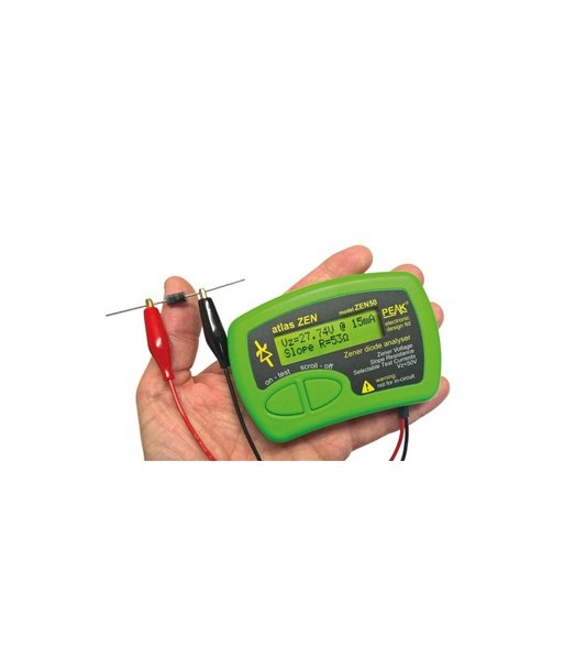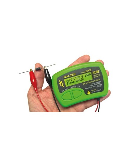 Testa diodos Zener, diodos Avalanche, VDRs, TVSs, cadeias LED e muito mais (até 50 V)¶Mede quebras de tensão (0.00 V a 50.00 V) com uma resolução tão afinada como 20 mV¶Mede o declive da resistência (até 1 kO em 15 mA com resolução 1O)¶Suporta a maioria dos diodos Zeners, Avalanche e diodos referência de 0 V até 50 V¶Ideal para testar VDRs, TVSs e outros tipos de dispositivo com proteção de voltagem¶Opções de corrente de teste : 2 mA, 5 mA, 10 mA, 15 mA¶Corrente de teste de ciclo curto para minimizar o aquecimento do seu componente, mesmo ao testar a 50 V e 15 mA.¶¶Pilha AAA alcalina (incl.)¶Pilha de longa duração e condições de teste reguláveis mesmo quando a voltagem da pilha é inferior a 1.0 V.¶¶Apresentação contínua da medição (atualizada 3 vezes por segundo)¶Função de retenção para reter os valores apresentados mesmo que o componente seja removido¶Garras douradas (tipo crocodilo)¶Manual do utilizador disponível (Inglês - Alemão - Italiano)¶¶Especificações¶Resumo de especificação a 20-25 ° C (68-77 ° F), a menos que especificado em contrário¶Amplitude de voltagem Zener (Vz): 0.0 V - 50.0 V¶Correntes de teste nomial (Iz) : 2mA, 5mA, 10mA, 15mA¶Precisão da corrente de teste definida: ± 1 % ± 0.2 mA¶Precisão da medição da voltagem Zener: ± 1% ± 40 mV¶Resolução da medição da voltagem Zener : 20 mV - 40 mV¶¶Precisão do teste de frequência: -1.5% ~ +1.5%¶60 V DC cumpre o limite inferior de 75 V (DC) para a Directiva de Baixa Tensão 2006/95 / CE¶Corrente de teste em curto-circuito (pulsado) : 35 % ± 0.2 mA¶¶Testar corrente do ciclo de funcionamento :¶MÍN: 0.1 %¶MÁX: 5 %¶típico: 1 %¶ciclo de serviço da corrente de teste destinado a manter a dissipação de energia de Zener em teste a níveis muito baixos¶¶Voltagem de abuso externo : ± 50 V¶¶Amplitude do declive da resistência:¶Iz = 2 mA: 0-8000 Ohm¶Iz = 5 mA: 0-3200 Ohm¶Iz = 10 mA: 0-1600 Ohm¶Iz = 15 mA: 0-1000 Ohm¶¶Resolução do declive de resistência apresentado:¶Iz = 2 mA: 5-1000 Ohm¶Iz = 5 mA: 2-1000 Ohm¶Iz = 10 mA: 1-1000 Ohm¶Iz = 15 mA: 1-1000 Ohm¶¶Precisão da medição do declive da resistência:¶Iz = 2 mA: ±1-10 Ohm¶Iz = 5 mA: ±1-4 Ohm¶Iz = 10 mA: ±1-2 Ohm¶Iz = 15 mA: ±1-2 Ohm¶¶Amplitude do declive da resistência: (Iz-50%) to (Iz+50%)¶¶Metódo de medição do declive da resistência :¶Diferenciação de curva que se encaixa:: (Iz-50%, Vz1), (Iz, Vz2), (Iz+50%, Vz3)¶Taxa de medição: 3 Hz¶Tempo para desligamento automático: 60 seg.¶¶Pilha:¶Tipo: 1 AAA alcalina¶Amplitude de tensão: 0.9 V - 1.6 V¶Alerta para pilha fraca: 1.0 V ± 0.05 V¶¶Temperatura de funcionamento: 10-40°C¶¶Dimensões (cabos excluídos): 103 x 70 x 20 mm¶Peso: 98 g¶Materiais fundamentais: plástico, vidro e metal¶