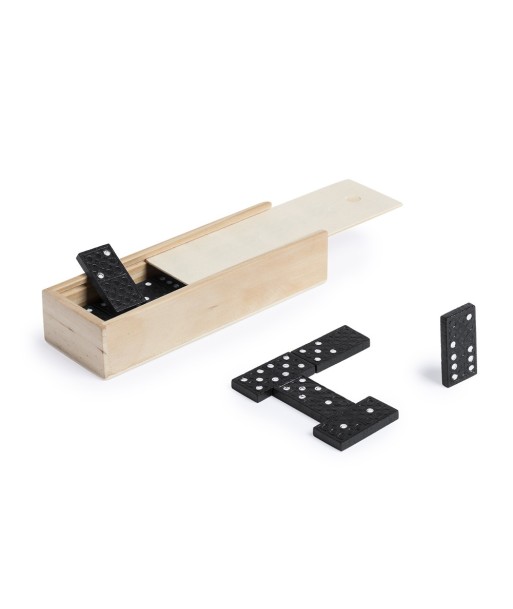 Dominó clásico de madeira de 28 peças. ¶¶Peças em design preto sóbrio com detalhes em branco. ¶Apresentado em caixa de madeira individual com tampa.