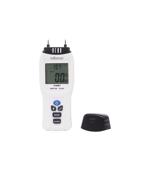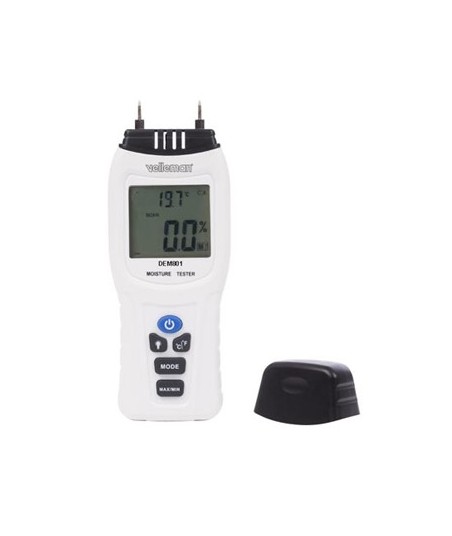 PARA:¶madeira¶gesso, pladur, cartão¶estuque, cimento, argamassa¶outros materiais de construção¶¶Grande visor LCD com retroiluminação¶Pinos eletrodos substituíveis¶Leitura em LCD digital 2-em-1 e gráfico de barras analógico¶Mede e exibe em simultâneo os valores da humidade e a temperatura¶Com função de retenção de dados e desativação automática¶¶Especificações¶¶eletrodos: 10 mm (substituíveis)¶amplitude de medição:¶humidade:¶madeira: 1 - 70 % RH¶materiais de construção: 0.1 - 2.4 % RH¶temperatura : -20 to +70°C (-4 to +158°F)¶¶Precisão:¶humidade:¶madeira: 0 - 30% : ± 1% , 30 % - 60 % : ± 2 % , 60 % - 70 % : ± 4 %¶outros materiais: ± 0.5 %¶temperatura: 0 - 50 °C : ± 1 °C (32 - 122 °F : ± 1.8 °F)¶¶Desliga automaticamente: após 30 segundos¶Alimentação: 1 x 9 V 6F22 (incl.)¶Temperatura de funcionamento: 0 - 50 °C (32 - 122°F)¶Humidade em funcionamento: 0 - 85 % RH¶Dimensões: 163 x 62 x 30 mm¶Peso: 153 g (incluindo a bateria)¶¶Informação sobre a embalagem¶Tipo de embalagem: Box (Carton)¶