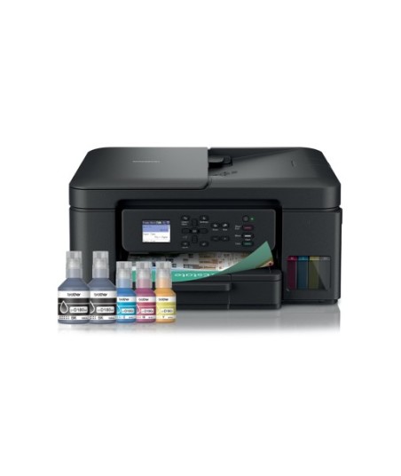 Cópia, Impressão Tankbenefit, Digitalização¶¶Imprima mais por menos com os frascos de tinta Tankbenefit de alto rendimento e os depósitos fáceis de encher que reduzem os seus custos de impressão.¶Seja no escritório em casa, na sala ou em qualquer outra parte da casa, desfrute de uma conectividade sem complicações e de uma impressão cómoda a partir do PC ou da App Brother Mobile Connect.¶Desfrute de uma gestão fluida do papel com uma bandeja de alimentação manual e um alimentador automático de documentos (ADF) de 20 folhas.¶¶Imprime até 16 páginas por minuto (ISO/IEC 24734)¶Impressão automática em frente e verso.¶Visor a cores de 4,5 cm¶WiFi 5GHz e USB¶Bandeja de entrada de papel de 150 folhas, alimentador automático de documentos de 20 folhas¶Inclui frascos de tinta com capacidade de aproximadamente 15.000 páginas a preto (2 x 7.500) e 5.000 páginas a cores¶¶Tipo de impressora: Cores¶Função: Cópia, Impressão, Digitalização¶Tecnologia: Jato de tinta¶Tamanho máximo do papel: A4¶Conetividade: USB, WiFi¶Memória: Interno (128 Mb)¶Painel de controlo: Teclado¶Visor: Sim (Visor LCD a cores de 4,5 cm)¶¶A Imprimir:¶Velocidade de impressão 1 face A4 a preto: 16 (páginas por minuto)¶Velocidade de impressão em frente e verso A4 a preto: 7 (páginas por minuto)¶Tempo de impressão da primeira página (2): Cores (6,5 segundos), Preto e branco (6.2 seconds)¶Impressão móvel: Sim¶Impressão frente e verso automática: Sim¶Resolução: Até 1.200 x 6.000 ppp¶Modo Silêncio: Sim¶Ciclo de trabalho: Até 1.000 páginas¶¶Entrada de papel: Alimentador automático de documentos (20 folhas), Ranhura de alimentação manual (1 folha), Standard (Bandeja 1) (150 folhas)¶Saída de papel: A4 (50 sheets)¶¶A Copiar:¶Velocidade de cópia 1 face A4 a cores: 8 (imagens por minuto)¶Velocidade de cópia 1 face A4 a preto: 11 (imagens por minuto)¶Resolução da cópia: Até 1.200 x 2.400 ppp¶FCOT desde modo listo (segundos): Mono (13,0 segundos), Cores (25.0 seconds)¶Funções de cópia: Cópias múltiplas/empilhamento/ordenação, Ampliação/redução, Cópia N em 1, Cópia 2 em 1 de documentos de identificação¶¶A Digitalizar:¶Tipo de scanner: CIS (sensor de imagem de contacto)¶Resolução: Interpolada (Até 19200 x 19200 ppp), Cores (1.200 x 2.400 ppp, 600 x 600 ppp), Vidro do scanner, ADF¶Profundidade da cor: Entrada (Processamento da cor de 30 bits), Saída (Processamento da cor de 24 bits)¶Velocidade de digitalização 1 face A4 a cores (3): 7 (imagens por minuto)¶Velocidade de digitalização 1 face A4 a preto (3): 17 (imagens por minuto)¶¶WiFiDirect: Sim¶WirelessSetupSupport: Sim¶¶Funções do scanner:¶Funções standard: Digitalização a (Ficheiro, Imagem, Email)¶Formatos de ficheiros suportados: PDF, JPEG, TIFF¶Funcionalidades de digitalização: Alinhamento automático¶¶Software fornecido:¶Software de Windows (Brother iPrint&Scan), Macintosh Software (Brother iPrint&Scan Desktop), Utilitários, Easy Setup¶¶Cartuchos¶BK (BTD180BK - 7500 pages), C, M, Y (BTD180CMY - 5000 pages)¶¶Incluído na caixa:¶Cabo de alimentação elétrica, Guia de instalação rápida, Garantia, Equipamento, Consumíveis¶¶Dimensões com caixa: 463mm (L) x 260mm (P) x 456mm (A)¶Peso com caixa: 9.3kg¶Dimensões sem caixa: 390mm (L) x 343mm (P) x 183mm (A)¶Peso sem caixa: 7.9kg¶¶Volume mensal recomendado¶Até 1.000 páginas¶¶Interface local¶Hi-Speed USB 2,0¶Interface de rede sem fios¶2,4 GHz: IEEE 802,11 b/g/n (modo infraestrutura), IEEE 802,11g/n (Wi-Fi Direct), 5GHz: IEEE 802,11a/n (Infrastructure Mode)¶Configuração WiFi suportada¶Sim¶WiFi Direct¶Sim¶¶Conectividade móvel e web¶Brother Mobile Connect (Android, iPad / iPhone), Apple AirPrint, Brother Print Service Plugin, Mopria®, Brother Apps, Web Connect¶