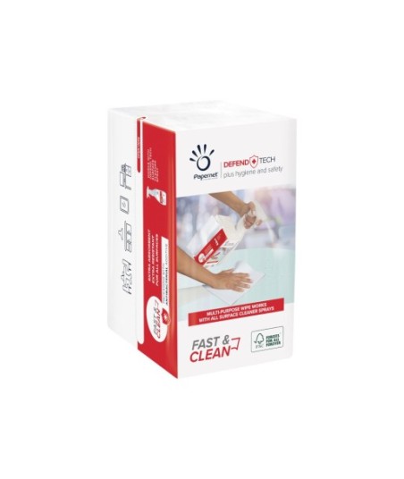 Folhas de papel multiusos, práticas e sempre à mão, desenvolvidas para limpar qualquer superfície e perfeitas para bares, cafetarias, restaurantes, cozinhas, cantinas, escritórios e hospitais. ¶¶O adesivo no verso da embalagem permite utilizar o produto com qualquer detergente em spray, enquanto a prática abertura facilita a extração de uma única folha, sem desperdício.¶¶Tecnologia Defend Tech¶¶Qualidade: Branco, Celulose Pura¶Nº de folhas: 2¶Folhas por pacote: 100¶Gramagem: 18 g/m²¶¶Altura da Folha: 33,25 cm¶Comprimento da folha: 21,6 cm¶Dimensões dobradas: 16,6 x 10,8 cm¶¶Certificações:¶EU ECOLABEL¶O rótulo ecológico da UE indica um produto que garante um impacto ambiental reduzido em todas as fases do seu ciclo de vida.¶FSC¶O FSC é o sistema de certificação de florestas, madeira e produtos derivados que garante que os produtos provêm de florestas geridas de acordo com normas ambientais, sociais e económicas rigorosas.