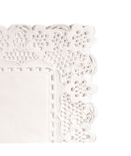 Os naperons de renda brancos, bordados e metalizados são a opção perfeita para apresentar os alimentos. ¶Fabricados em papel de celulose branco puro de 53g/m2.¶É um produto de qualidade extra.¶¶Faixa de temperatura: 0ºC/+70ºC¶Certificados: Contato alimentar, Registo sanitário, Reach¶¶Biodegradável¶Não apto para micro-ondas¶Não apto para o forno¶Reciclável¶¶Material: Papel¶Cor: Branco¶Tamanho: 21x27cm¶Gramagem: 47 g/m²¶¶¶