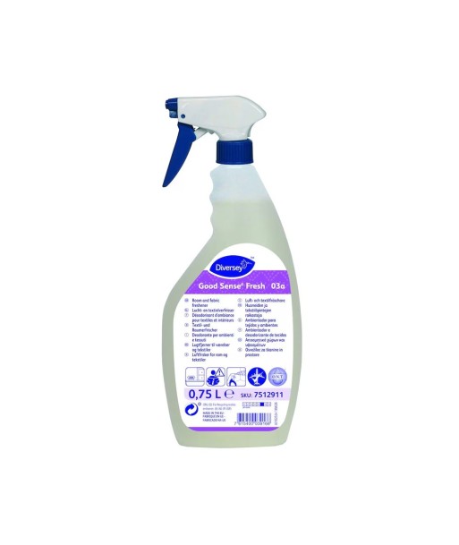 Good Sense Fresh é um produto pronto a usar, em spray sem ser aerossol, para a eliminação de odores de tecidos e mobiliário.¶¶Tecnologia única, patenteada de Neutralização de Odores (O.N.T.)¶Ação rápida e frescura de longa duração¶Eficaz contra uma vasta variedade de odores (tabaco, comida, urina, etc.)¶Seguro em tecidos de cor fixa, tecidos ou mobiliário lavável¶¶O.N.T. neutraliza os maus odores, realçando o efeito do perfume¶Rapidamente deixa os espaços e o mobiliário a cheirar a fresco e a limpo¶Pode ser aplicado como parte de uma rotina normal de limpeza¶Adequado para uso em todas as áreas e na maioria dos tecidos e mobiliário¶Testado por laboratórios independentes para a limpeza de aeronaves¶¶Instruções de utilização:¶Aplicação de pulverização pronto a usar¶Pulverizar o tecido ou a superfície uniformemente até ficar húmido.¶Odores são eliminados à medida que o tecido seca.¶Pode ser necessário uma segunda aplicação para odores difíceis.¶O tempo de secagem dependerá da quantidade de produto distribuído.¶Deixar secar bem os tecidos antes de utilizar.¶¶Compatibilidade do produto:¶Não usar em seda, couro, tecidos e cors não fixas, ou tecidos não laváveis. ¶antes de utlizar, testar a solidez das cores e a compatibilidade dos materiais num local pequeno e pouco visível. Remover salpicos ou acumulação de produto de pavimentos duros, pois as superfícies podem tornar-s escorregadias.¶¶Recomendações:¶GoodSense Fresh é adequado para limpezas AirCraft, testado e aprovado pela SMI Inc. Miami-Florida-USA com o Nº 1711-323 de acordo com a AMS 1550B, produto de limpeza, base de água, interiores de aeronaves, materiais de superfícies duras.