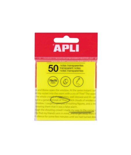 Cubo de 50 folhas de notas autoadesivas transparentes de 75 x 75 mm em cor amarela.¶¶Ideal para fazer anotações rápidas para destacar informações importantes em documentos, sem perder a visibilidade do texto ou da imagem original, ou para estudar sem a necessidade de marcar livros se estes forem emprestados.¶¶Resistentes à água.¶Recomendada a utilização de lápis ou canetas com tinta à base de óleo para uma secagem mais rápida e para evitar rasuras acidentais.¶