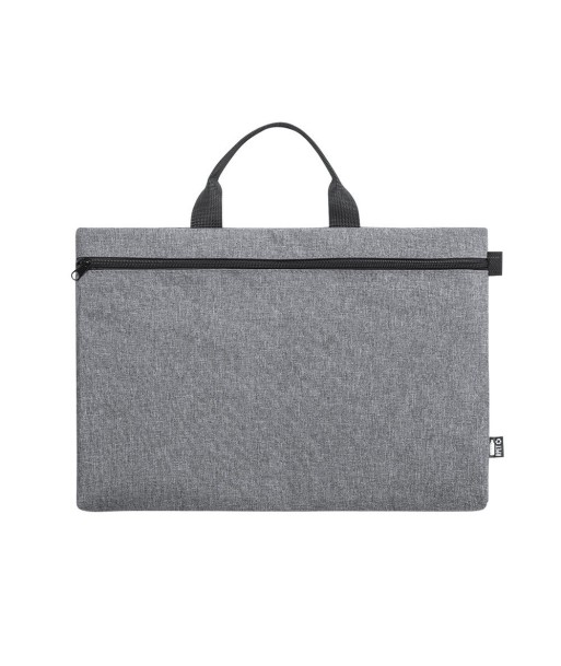 Porta-documentos de linha nature em resistente 600D RPET efeito melange, elaborado a partir de plástico reciclado para assim incentivar a reutilização de resíduos plásticos e contribuir para a sustentabilidade do planeta. ¶Detalhes pretos e compartimento principal com fecho de correr.¶Alças resistentes a condizer e distintivo RPET na etiqueta exterior.¶Poliéster 600D RPET¶¶Medidas: 39 x 27 x 3.5 cm / 116g¶Cor: Cinzento