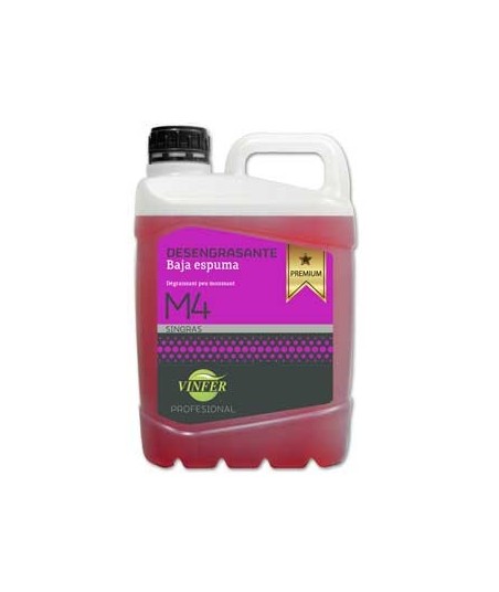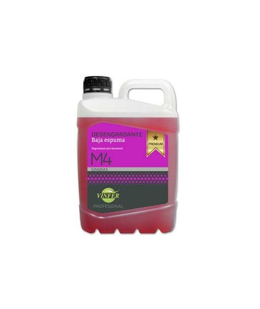 Detergente M4 - 5L¶¶PROPRIEDADES:¶Detergente/desengordurante alcalino de elevada concentração e espuma controlada, apto para pavimentos muito sujos de fábricas, cozinhas escolares, estacionamentos publicos.¶Formulado especialmente para eliminação de gorduras, óleos e outras sujidades.¶Uso manual ou máquina de limpeza. Sem amoniaco/com monoetanolamina. Com alta concentracao em bioalcool.¶¶APLICAÇÃO E MODO DE UTILIZAÇÃO:¶Dosear o produto no depósito da Maquina de lavar. Diluir com agua entre 15%-20% em função da sujidade do chão.¶¶Odor: Caraterístico ¶Cor: Carmesim ¶Densidade: 1,00-1,04 g/ml ¶pH: 12,5-13,5 ¶Viscosidade: Não aplicável
