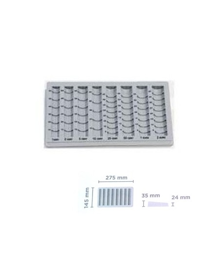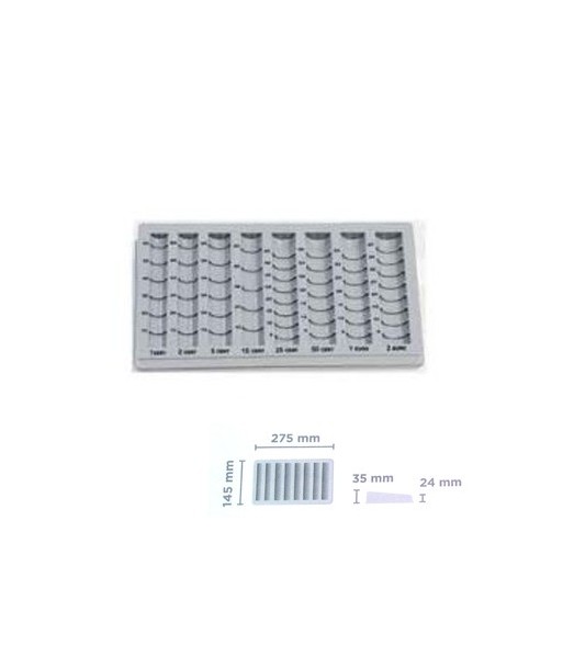 Fabricada em material plástico de grande resistência. ¶Distribuida em 8 colunas com o valor de cada moeda gravada em relevo. ¶¶Comprimento: 275mm¶Largura: 145mm¶Altura mais alta: 35mm¶Altura mais baixa: 24mm