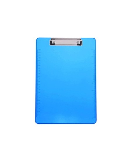 Prancheta de plástico translúcido colorido.¶Ideal para trabalho de campo ou uso de escritório.¶Comporta um bloco de escrita ou 80 folhas, e encaixa na maioria das pastas,¶Mola forte de metal de baixo perfil com escalas, buraco de fechadura retrátil para pendurar.¶¶Cores: Azul Translúcido