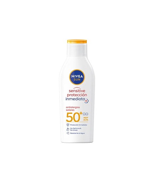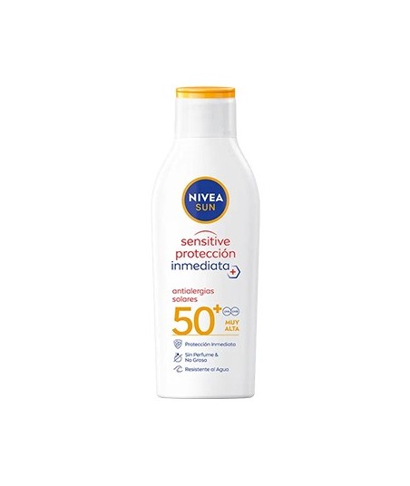 NIVEA SUN SENSITIVE LOÇÃO SOLAR ANTIALÉRGICA FP50+¶Com a sua fórmula de alta proteção imediata contra os raios UVA/UVB e antioxidantes, protege a pele das alergias e irritações do sol. ¶Especialmente indicado para peles sensíveis, a sua fórmula sem perfume com Aloe Vera Bio e antioxidantes é resistente à água.¶Fórmula amiga do oceano: sem filtros UV de Octinoxato, Oxibenzona ou Octocrileno.¶Sem Microplásticos. 61% fórmula biodegradável.¶¶ULTRA SPECTRUM PROTECTION - Proteção imediata contra os efeitos dos raios UVA/UVB e da Luz Azul (HEVL), como o envelhecimento prematuro da pele¶ADEQUADO PARA PELES SENSÍVEIS - Fórmula sem perfume com Aloe Vera Orgânico que protege contra alergias e irritações solares¶SUSTENTABILIDADE - Fórmula amiga do oceano: sem filtros UV de Octinoxato, Oxibenzona ou Octocrileno.¶ Sem Microplásticos. 61% Fórmula biodegradável¶Fórmula resistente à água¶