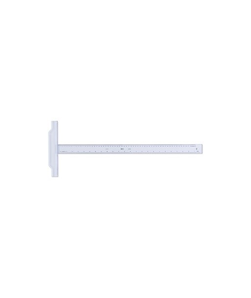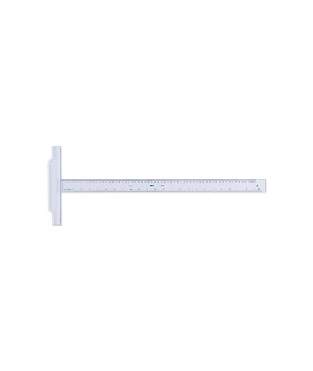 A régua T é usada para traçar retas, uma do lado da outra num desenho ou criar linhas de vários ângulos com um conjunto de esquadros.¶Material poliestireno transparente¶Passo milimétrico e de polegada¶Borda de tinta na parte superior¶Contém um buraco, no topo da régua para pendurar ¶