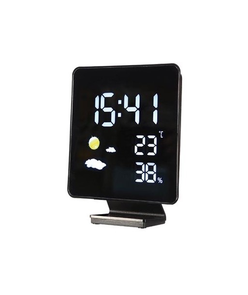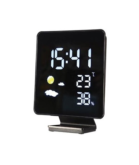 Estação meteorológica com ecrã a cores para interiores,¶Intensidade regulável,¶Medições no interior: temperatura - humidade,¶Previsão meteorológica com ícones: sol - sol & nuvens - nuvens - chuva,¶Apresentação das temperaturas mínima e máxima,¶Indicador da temperatura: °C - °F,¶Exibir hora: data - dia da semana - hora (12h/24h),¶Alarme com função "snooze" (adiar alarme), ¶¶Especificações¶Amplitude da temperatura interior: 0 °C a +50 °C¶Precisão da temperatura interior: ± 1 °C¶Amplitude da humidade interior: 25%-95%¶Precisão da humidade interior: ± 5%¶Intervalo de medição: 30 seg¶¶Dimensões: 137 x 49 x 173 mm¶Peso: 240 g¶¶Fonte de alimentação¶Adaptador (incl.): 5 VDC 1.2 A¶Pilha: 3 x LR03¶¶
