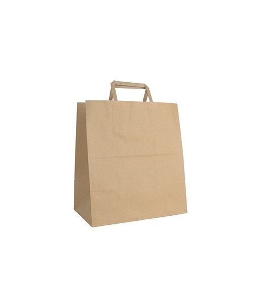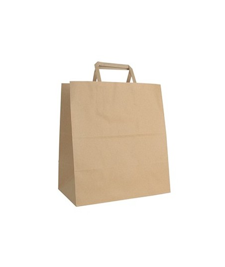 SACOS SOS COM ALÇAS. São mais achatados para que a base seja alargada e têm menos altura. Ideais para restauração ou take-away.¶¶Material: Kraft reciclado¶Cor: Natural¶Largura: 27cm¶Profundidade: 16cm¶Altura: 28cm¶Gramagem: 90 g/m2¶¶Certificados: Contato alimentar, PEFC, Registo sanitário¶Usos: Biodegradável, Reciclável, Reutilizável, Contém fibras recicladas