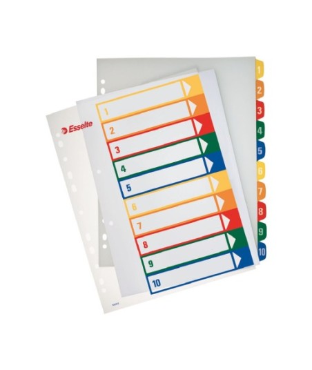 Índice reutilizável e extra duradouro em combinações de cores brilhantes. ¶Com tabela de conteúdo imprimível em PC para uso personalizado. ¶Faça o download do modelo em: www.esselte.com/easyprint¶¶Forte e duradouro com polipropileno resistente.¶¶O formato A4+ permite acesso rápido mesmo quando usado com bolsos.¶¶10 separadores coloridos impressos 1-10 para facilitar a classificação.¶Ajuste universal de 11 furos¶¶Cor: Multicolor¶Dimensões: 245 x 305 x 3 mm
