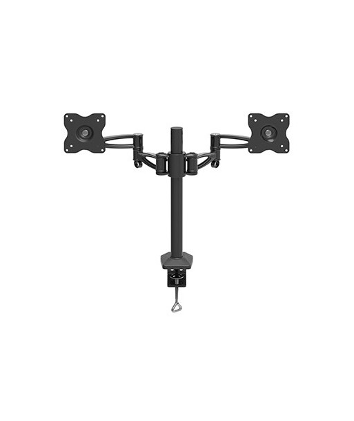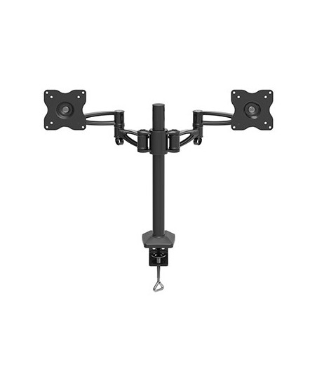 Suporte de mesa de monitor duplo para monitores/Tvs. As opções de movimento permitem ajuste vertical, rotação de 360°, dobra, placa de conexão da tela giratória de 180° e inclinação livre de ferramentas de - 9° a 9°. A montagem garante uma ampla faixa de movimento para alcançar a posição de visualização ergonomicamente adequada. Compatível com TVs com padrão VESA (padrões de furos de montagem em suporte) 75x75 e 100x100 mm. Montagem rápida e fácil em superfícies de 0,4"-2,7" / 1-7 cm de espessura sem perfuração.¶¶Funções: 5 movimentos - Ajuste vertical, girar, dobrar, girar e inclinar¶Tamanho máximo da TV: 13" - 29" / 33 - 74 cm¶Peso máximo da TV: 6kg por ecran¶TV VESA: de 75x75mm até 100x100mm¶Tipo de TV: TV plano, TV curvo¶Largura máxima por tela: 27,1"/ 69cm.¶Altura mínima do centro de conexão da tela até a mesa: 5,7" / 14,5 cm.¶Altura máxima do centro de conexão da tela até a mesa: 17,7" / 45 cm.¶Cor: Preto