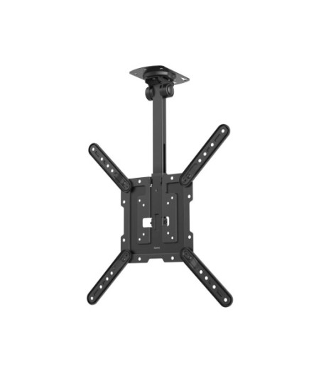 O melhor lugar para a televisão é no meio da sala. Infelizmente, um móvel de TV no meio da sala não fica muito bem. ¶Como é que resolve este problema? Basta pendurar o televisor no teto! Este suporte de teto torna-o possível.¶¶O suporte de TV flexível para tetos e telhados inclinados combina exigências pragmáticas e estéticas: formato elegante e discreto para uma sensação de cinema em casa a partir de qualquer ângulo, adequado para ecrãs planos com uma diagonal de ecrã de 81 a 165 cm (32 a 65")¶¶Ajuste variável da distância ao teto: O suporte regulável em altura pode ser ajustado de forma óptima ao tamanho do televisor (distância entre o teto e a placa de montagem entre 60 cm - 69,4 cm)¶¶O suporte de teto com braço giratório torna o televisor rotativo: pode ser rodado até 100° (apenas quando montado no teto)¶¶Extremamente confortável e economizador de espaço para uma colocação óptima do ecrã plano em qualquer divisão, desde a sala de estar à cozinha, ao quarto das crianças e ao quarto¶Adequado para a montagem no teto de televisores e ecrãs planos em salas de estudo e escritórios domésticos¶¶Carga Máx: 40kg¶Função Adicional: Nível¶Distância máxima do teto: 69,4 cm¶Distância mínima do teto: 60cm¶Tamanho do furo: Até M8¶¶Cor: Preto¶Material: Chapa de aço¶Largura da placa de montagem: 10,5cm¶Comprimento da placa de montagem: 16,5cm¶VESA (de-para) 75x75 - 400x400