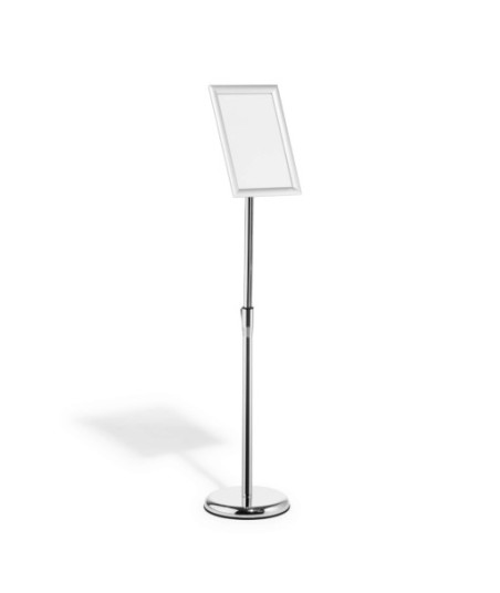 Suporte de informação de montagem rápida com estrutura dobrável em alumínio DIN A4 robusto, anodizado a prata ¶Ideal para restaurantes, comércio, museus, exposições, feiras, áreas de receção e de espera, salas de conferência, etc.¶¶Altura ajustável com haste telescópica (pode ser ajustada em passos de 770 mm até uma altura máxima de 1.205 mm em formato de retrato) ¶A estrutura dobrável pode ser facilmente rodada do formato vertical para o horizontal - Ângulo de leitura ajustável através de uma articulação esférica.¶A elevada estabilidade pode ser garantida através do enchimento opcional da base (diâmetro: 250 mm) com areia.¶A base redonda com anel de borracha evita riscos no chão .¶¶Cobertura de proteção resistente aos raios UV e de baixo reflexo ¶Painel posterior em poliestireno resistente ao impacto ¶Cantos recortados ¶¶Tipo de base/montagem: Suporte de chão¶O conjunto inclui painéis de visualização: Sim ¶Altura ajustável: Sim¶Inclui instruções de montagem: Sim ¶Antibacteriano: Não ¶Antirreflexo: Sim ¶¶Para formato: A4¶Quantidade de enchimento: 1 Folha¶¶Rotação: 360º¶Ângulo de leitura ajustável: 5º - 90º¶¶Altura externa (mm): 1205¶Diâmetro da base Ø (mm): 250¶¶Largura do painel de visualização interior (mm): 192 ¶Altura do painel de visualização interior (mm): 279¶