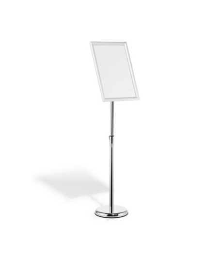 Suporte de informação de montagem rápida com moldura dobrável em alumínio DIN A3 robusta, anodizado a prata.¶¶Ideal para restaurantes, lojas, museus, exposições, feiras comerciais, áreas de receção e de espera, salas de conferência, etc.¶¶Regulável em altura com haste telescópica. ¶Pode ser ajustado em passos de 860 mm até uma altura máxima de 1.290 mm em formato de retrato ¶A moldura dobrável pode ser facilmente rodada de retrato para paisagem ¶¶Ângulo de leitura regulável por articulação esférica ¶Cobertura de proteção resistente aos raios UV e de baixo reflexo¶Painel traseiro em poliestireno resistente a impactos ¶Cantos recortados ¶¶A elevada estabilidade pode ser assegurada através do enchimento opcional da base (diâmetro: 250 mm) com areia. ¶¶Diâmetro da base: 250 mm¶Altura máx: 1290 mm¶¶Painel interior do ecrã¶Largura: 278 mm¶Altura: 402 mm
