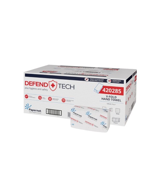 As toalhas de mão dobradas Defend Tech são o aliado ideal para a higiene pessoal. ¶As toalhas de papel garantem uma proteção e segurança adequadas para a higiene das mãos.¶¶Qualidade: Branco, Celulose Pura¶Nº Folhas: 2¶Folhas por Clip: 210¶Gramagem: 19 g/m²¶¶Altura da Folha: 21 cm¶Comprimento da Folha: 22cm¶Dobrado: 22 x 10.5 cm¶¶Embalagens por caixa: 15¶Dimensões da caixa: 23 x 38.5 x 55 cm¶Volume: 0.049 m3¶¶DEFEND TECH¶A gama de produtos Defend Tech é o resultado da investigação e inovação contínuas da Papernet. ¶Uma nova abordagem de vanguarda para apoiar a prevenção quotidiana de clientes e utilizadores. ¶Um círculo virtuoso de proteção avançada, formado pelas melhores tecnologias, para elevar ainda mais os padrões de higiene dos produtos de papel, dispensadores, sabonetes e géis antibacterianos.¶¶Certificações¶EU ECOLABEL¶O rótulo ecológico da UE indica um produto que garante um impacto ambiental reduzido em todas as fases do seu ciclo de vida.¶FSC¶O FSC é o sistema de certificação de florestas, madeira e produtos derivados que garante que os produtos provêm de florestas geridas de acordo com normas ambientais, sociais e económicas rigorosas.¶