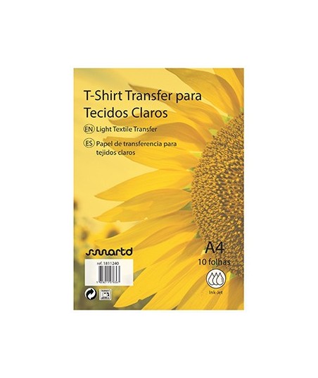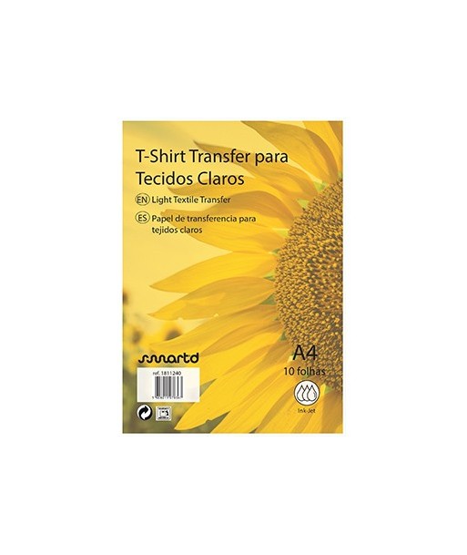 Papel de transferência de alta qualidade para tecidos de algodão brancos ou de cores claras.¶Espessura: 65 µm¶¶Perfeito para transferir imagens para t-shirts para eventos "únicos", como festas de aniversário de crianças, noites de despedida de solteiro(a), viagens de aventura para jovens, promoções de curta duração em lojas.¶¶Para impressão em t-shirts, basta imprimir o desenho, fotografia ou o que pretender no transfer, recortar, colar em cima do tecido, passar com o ferro de engomar e em poucos segundos tem uma t-shirt personalizada.¶¶VANTAGENS¶Cores vibrantes¶Excelente definição dos contornos¶Fixação estável da tinta¶O tecido mantém-se suave ao tato, não parece sintético¶Optimizado para várias lavagens¶¶INSTRUÇÕES¶Os tecidos devem ter um teor de algodão de pelo menos 50% e devem ser lavados antes da transferência.¶Por razões de qualidade, o PAPEL DE TRANSFERÊNCIA TÊXTIL LEVE deve ser armazenado originalmente embalado sob 10-30°C (50-86°F) e 30-65% humidade relativa. Nestas condições de armazenamento as propriedades do produto permanecem inalteradas por até 2 anos.¶¶
