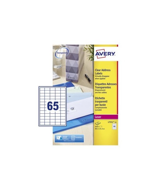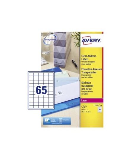Torne as correspondências não entregues uma coisa do passado, adicionando seu endereço de retorno às suas correspondências. As Mini Etiquetas de Endereço Avery Clear são uma ótima maneira de garantir que correspondências não entregues sejam devolvidas ao remetente. Essas etiquetas transparentes de tamanho pequeno vêm em 65 etiquetas por folha dedicadas para uso em impressoras a laser preto e branco ou coloridas. Eles ficarão nítidos e elegantes no verso de seus envelopes e deixarão a cor de seus envelopes brilhar.¶¶E com nossa tecnologia QuickPEEL, a aplicação de etiquetas é rápida. Simplesmente divida as 65 etiquetas na folha ao longo da perfuração para expor as bordas da etiqueta e, em seguida, descole e aplique, é muito fácil e torna a etiquetagem de sua correspondência muito mais rápida.¶¶Dimensões: 38,1 x 21,2 mm¶Conteúdo: 1625 Etiquetas / 25 Folhas¶Tipo de impressora: Laser¶Código de software: L7551¶Tipo de adesivo: Permanente¶Material: Poliéster¶Tipo de revestimento: Revestido a Laser¶Formato: A4