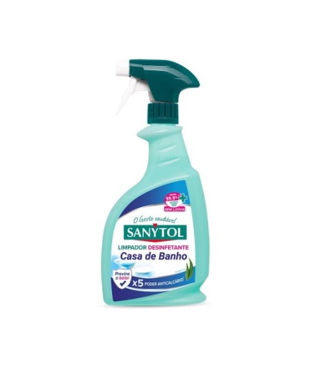LIMPA E DESINFETA WCs. A humidade promove o desenvolvimento de bactérias, fungos e vírus. O uso de um desinfetante associado a um poderoso anti-calcário é a única forma de prevenir eficazmente a proliferação de microrganismos indesejáveis, a formação de mofo e calcário.¶¶Sanytol Desinfetante Banhos, sem lixívia, garante uma higiene perfeita e destrói 99,9% dos microorganismos. A sua fórmula ultra poderosa remove sem esforço o calcário e os vestígios de sabonete incrustados.¶¶Elimina 99,9% de bactérias, fungos e vírus H1N1 (gripe)¶Previne o aparecimento de mofo¶Sem lixívia¶Remove o calcário e abrilhanta¶Sem resíduos agressivos¶¶ADEQUADO PARA¶Lavatórios, torneiras, resguardos de chuveiro, banheiras, sanitários¶Ladrilhos, superfícies de aço inoxidável, cerâmico¶¶FORMATO Pistola 750ml¶FRAGRÂNCIAS Eucalipto¶¶CONSELHOS DE UTILIZAÇÃO¶Pulverize o produto nas superfícies a limpar. Deixar atuar e enxague posteriormente. Para resíduos persistentes, deixe atuar mais tempo e repita a operação se necessário. Para uma ação de desinfeção profunda, deixe atuar 15 min.¶